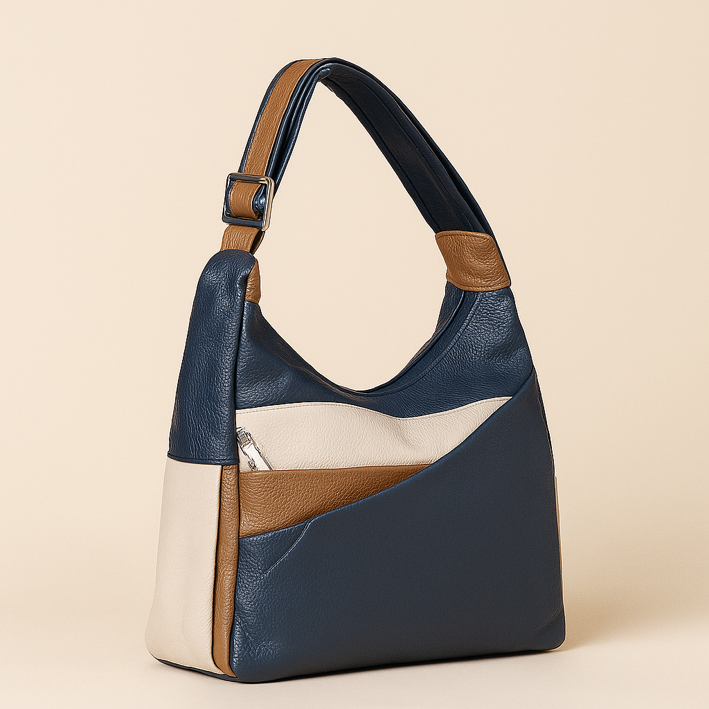 Ova elegantna ženska torba od kvalitetne eko kože, napravljena u modernoj kombinaciji teget, bež i camel nijansi, idealna je za svaki dan – posao, šetnju, putovanja ili gradske obaveze. Dizajnirana je tako da izgleda luksuzno, ali da pritom bude maksimalno funkcionalna.